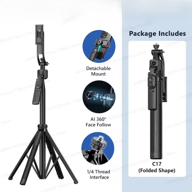 1630mm/64in C17 Tripod Selfie Stick 360° Auto Rotation Shooting Quadruped Phone Stand Face Track Bluetooth Remote Control Tripie