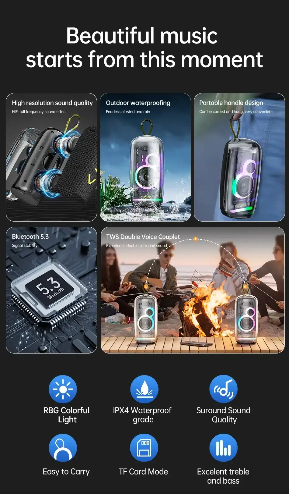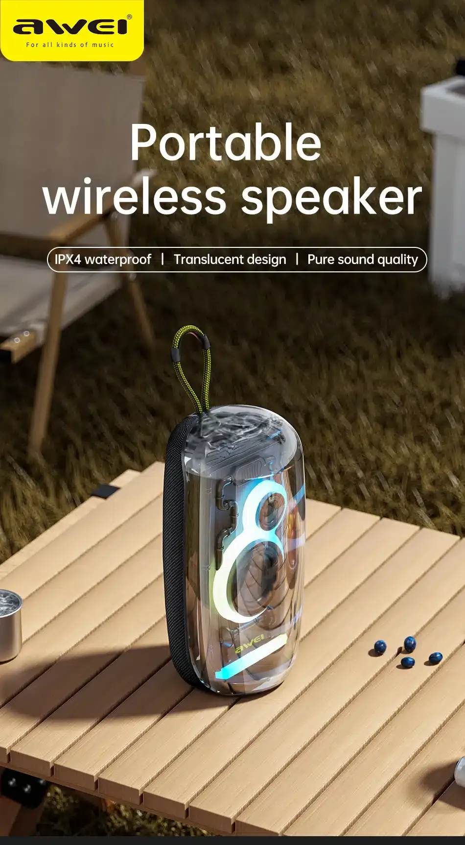 - Colorful Lighting: This speaker offers eye-catching light, bringing joy and delight to your life