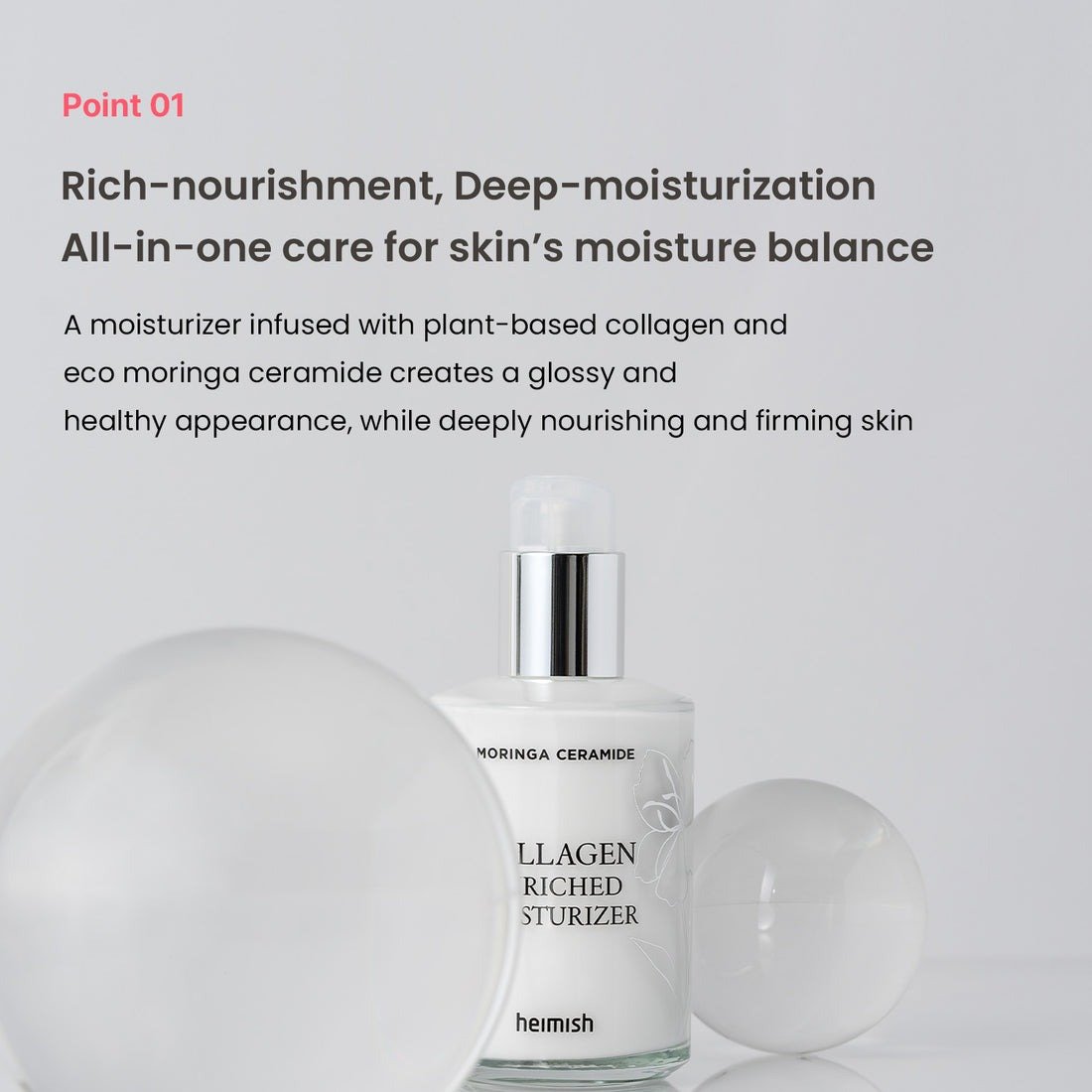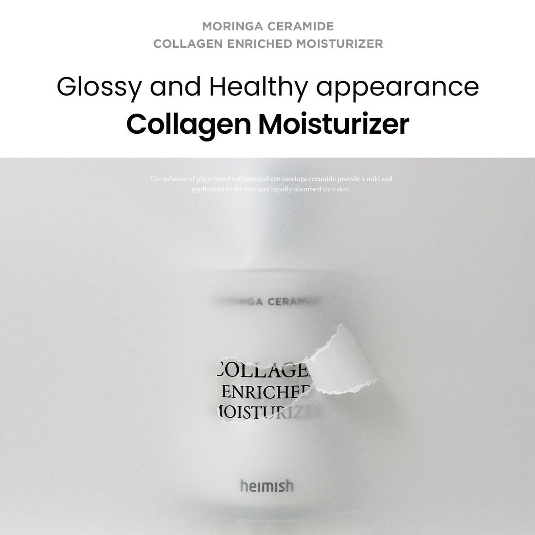 Heimish Moringa Ceramide Collagen Enriched Moisturizer delivers deep hydration, strengthens the skin barrier, and enhances elasticity with Moringa Extract, Ceramides, and Collagen for soft, plump, and youthful skin.