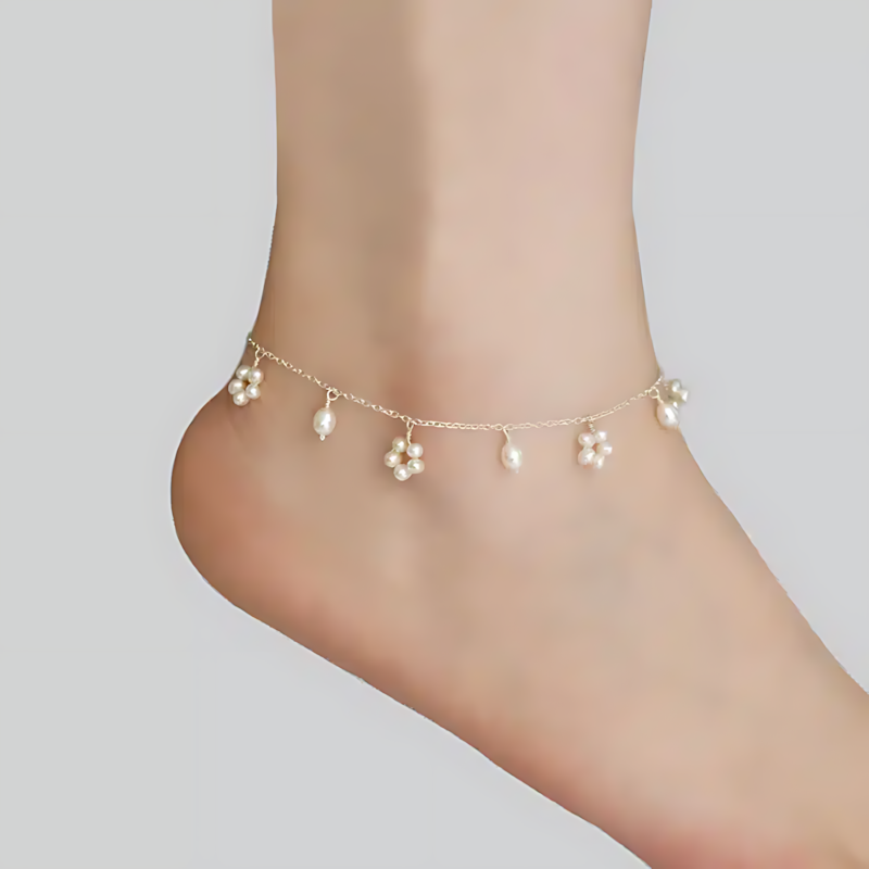 This elegant pearl anklet features delicate freshwater pearls gracefully arranged on a sleek silver-tone chain. The subtle dangling pearl accents add gentle movement and charm, making it perfect for both everyday wear and special occasions. A timeless piece that brings soft sophistication to any look.