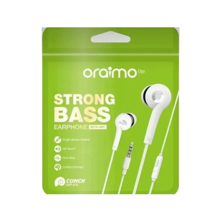 DescriptionOEP-E10 Strong Bass Earphones With Mic – Pure Bass: Employing oraimo premium drives, conch earphone generates bass that is deep and powerful.HD Sound: The central diaphragm delivers clear and natural sound with rich detail, so you can immerse yourself completely in your music.Single Button Control: The single button remote and mic allows for easy music control and hands-free calls.Comfort Ear-tips: Seek ergonomics design ear-tips adds unprecedented comfort to the listener’s experience – allowing a longer, more enjoyable experience.